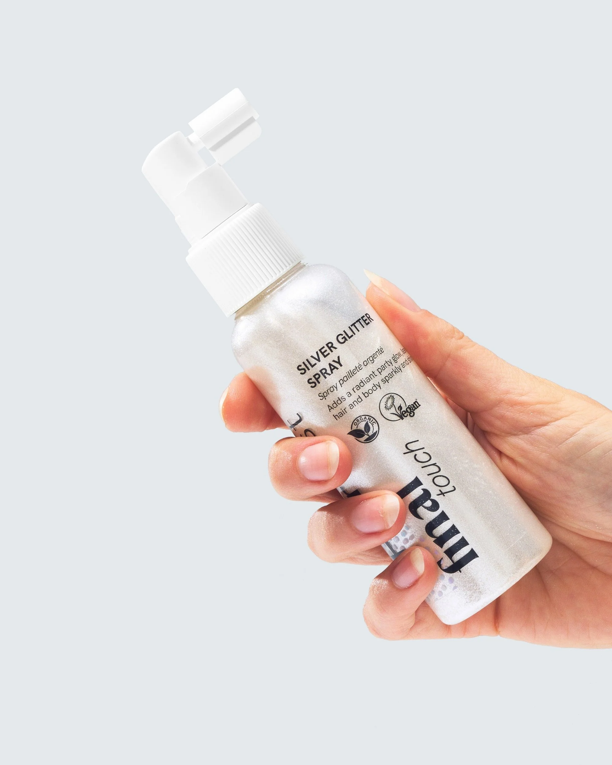 Final Touch™ Silver Glitter Spray saa sinut säihkymään! Tämä kevyt suihke sisältää erittäin hienoa hopeaglitteriä, joka antaa säihkyvän hehkun ja saa sinut loistamaan. Ekologisilla goji-, selja- ja mangouutteilla rikastettu glittersuihke ravitsee ja suojaa ihoa sekä hiuksia jättämättä niitä tahmeiksi.